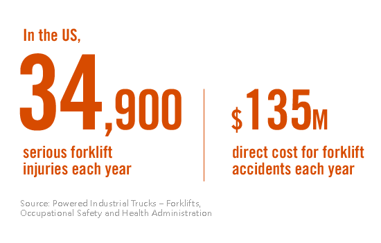 According to the Occupational Safety and Health Administration (OSHA), there are roughly 34,900 serious injuries each year in the US due to forklift accidents. Once again, the leading cause is operator distraction.